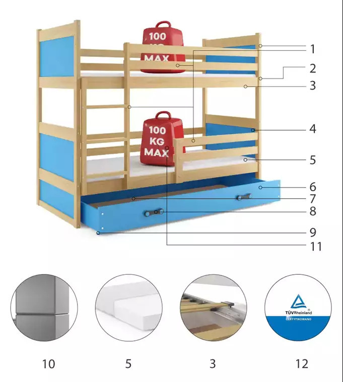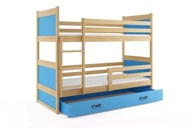 Dětská patrová postel RICO se šuplíkem 90x200 cm, včetně matrací, Přírodní/Modrá