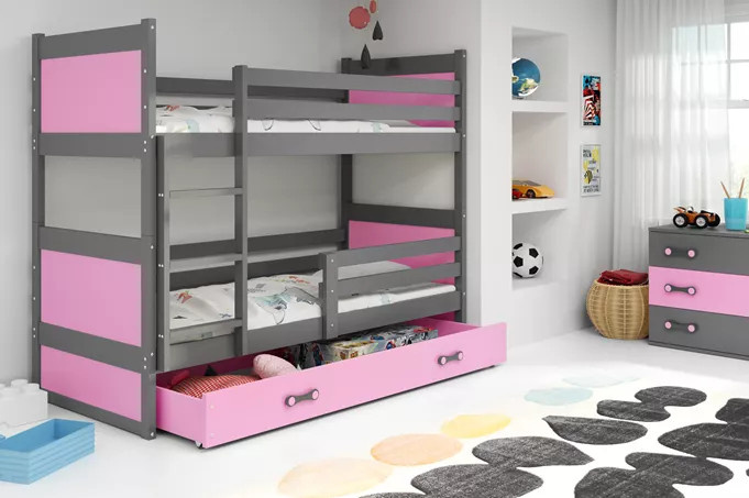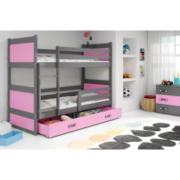 Dětská patrová postel RICO se šuplíkem 90x200 cm, včetně matrací, Grafit/Růžová