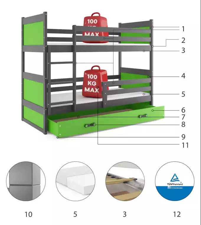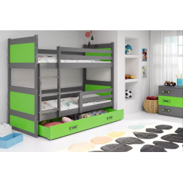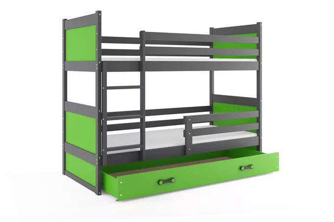 Dětská patrová postel RICO se šuplíkem 90x200 cm, bez matrace, Grafit/Zelená