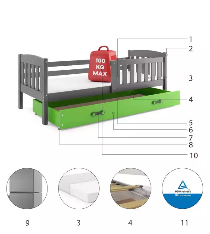 Dětská postel KUBUS 90x200 cm se šuplíkem, bez matrace, Grafit/Zelená