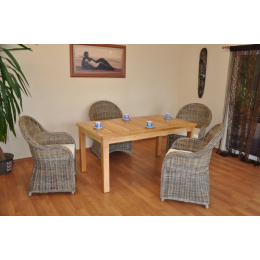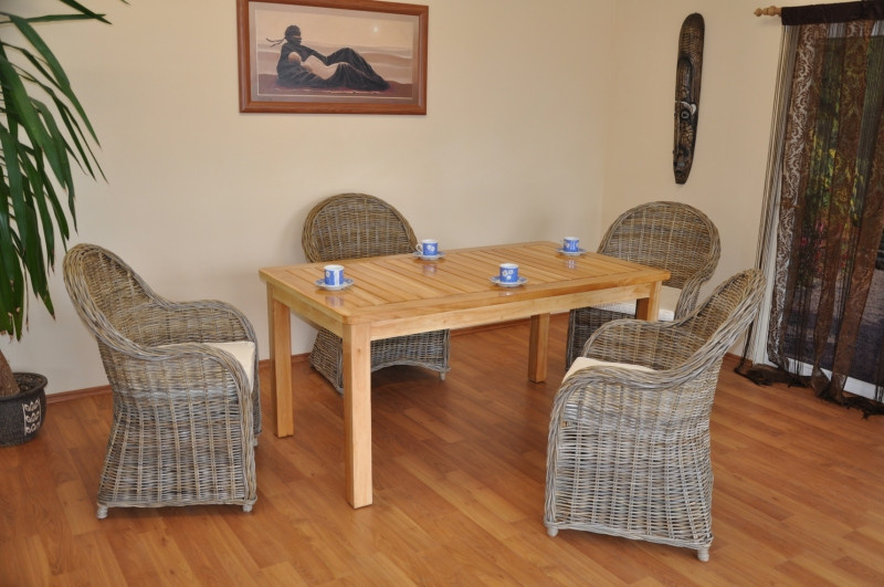 Luxusní jídelní sestava pro 4 osoby. Stůl vyrobený z masivního mahagonového dřeva doplňují 4 křesla ručně pletená z ratanu kubu v přírodní šedé barvě. | Křeslo: materiál konstrukce je přírodní ratan kubu v přírodní šedé barvě. Materiál výpletu je ratan kubu v přírodní šedé barvě. Ratan kubu se vyznačuje velkou pevností a odolností. Křeslo má díky tomu velice pevnou konstrukci Stůl: masivní mahagonové dřevo Velikost křesla je 64x63x90 cm, nosnost křesla je 125 kg Velikost stolku je 160x90xvýška 75 cm