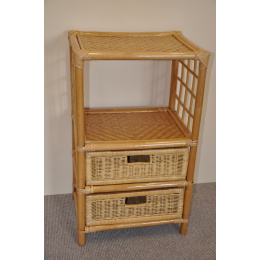 Ratanová komoda se 2 praktickými zásuvkami a otevřenou policí. | Barva ratanové konstrukce i ratanového výpletu je medová. Zásuvky mají dřevěnou kostru a vypleteny jsou přírodním ratanem. Velikost komody je 45x36x75 cm