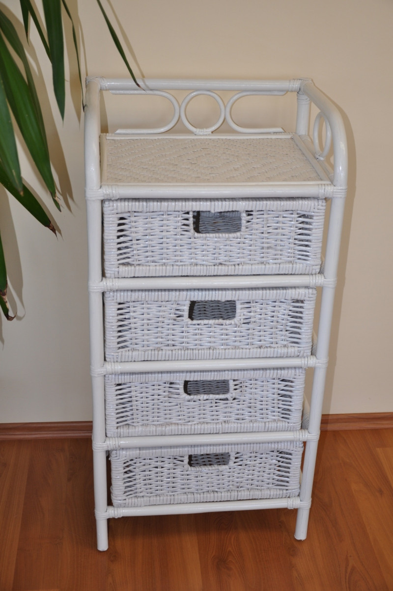 Ratanový nábytek -ratanová komoda 4 zásuvky. Konstrukce i výplet jsou z přírodního ratanu . Komoda má široké možnosti využití a je praktickým doplňkem do každé domáctnosti. | Barva ratanové konstrukce a výpletu je bílá. Velikost komody je 45x36x95 cm
