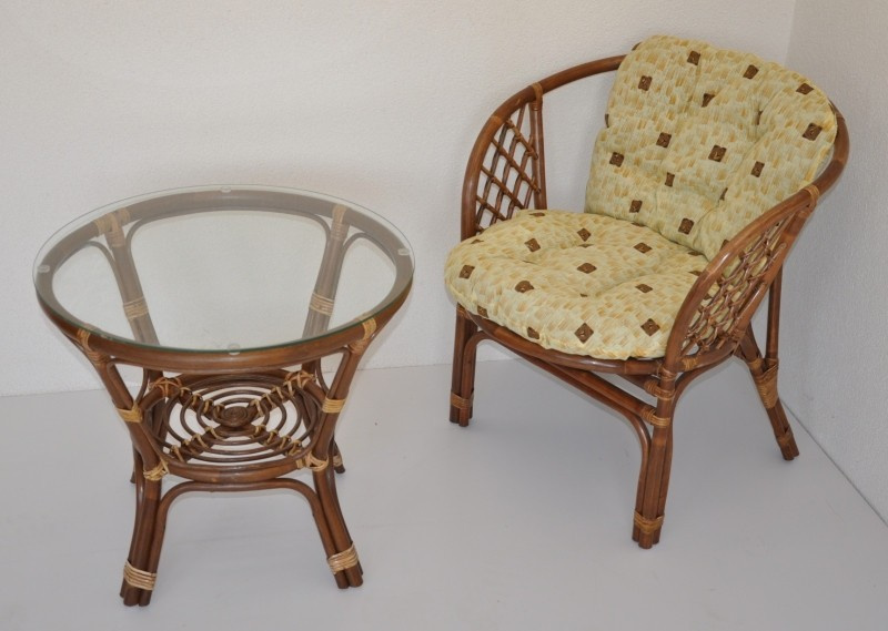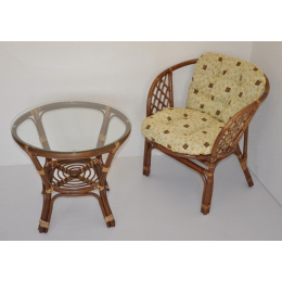 Ratanová sedací souprava je vyrobena z přírodního ratanu s barvou konstrukce odpovádající fotografii výrobku,obsahuje 1 křeslo a stolek se sklem. | Barva konstrukce je hnědá. Rozměr křesla je 68x66x73 cm, výška sedu 44 cm. Stolek výška 55 cm, průměr stolku 60 cm. Nosnost křesla 110 kg.