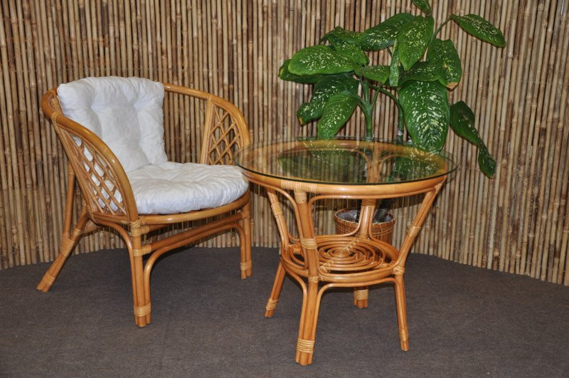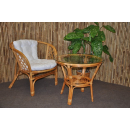 Ratanová sedací souprava je vyrobena z přírodního ratanu s barvou konstrukce odpovádající fotografii výrobku,obsahuje 1 křeslo a stolek se sklem, polstry jsou vyrobeny v ČESKÉ REPUBLICE. | Barva konstrukce je medová, rozměr křesla 68x66x73 cm, výška sedu 44 cm, stolek výška 55 cm, průměr stolku 60 cm, nosnost křesla 110 kg. Spoje konstrukce jsou šroubovány. Polstry lze prát ručně na 40oC nebo čistit v čistirně