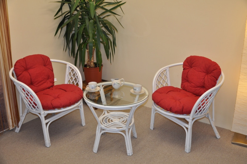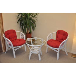 Ratanová sedací souprava je vyrobena z přírodního ratanu s barvou konstrukce odpovádající fotografii výrobku,obsahuje 2 křesla a stolek se sklem, kompletní sadu polstrů vyrobených v ČESKÉ REPUBLICE. | Barva ratanové konstrukce i výpletu je bílá. Velikost křesla je 68x66x73 cm, výška sedu 44 cm,nosnost křesla 110 kg. Stolek výška 55 cm, průměr stolku 65 cm. Hlavní spoje ratanové konstrukce jsou šroubovány. Polstry na tuto sedací soupravu Bahama jsou vyrobeny v České republice. Polstry jsou vyrobeny z kvalitní látky a vyznačují se vysokou kvalitou zpracování.Polstry pro nás vyrábí firma AXIN Cuschions s.r.o., která zaměstnávávýhradně místní vyučené švadleny z České republiky. Tímto způsobem sesnažíme podporovat výrobu a zaměstnanost v naší republice. Náplň polstrů je drcený molitan a polstry lze prát ručně na 40o C.