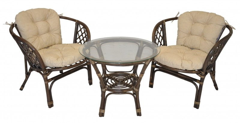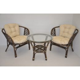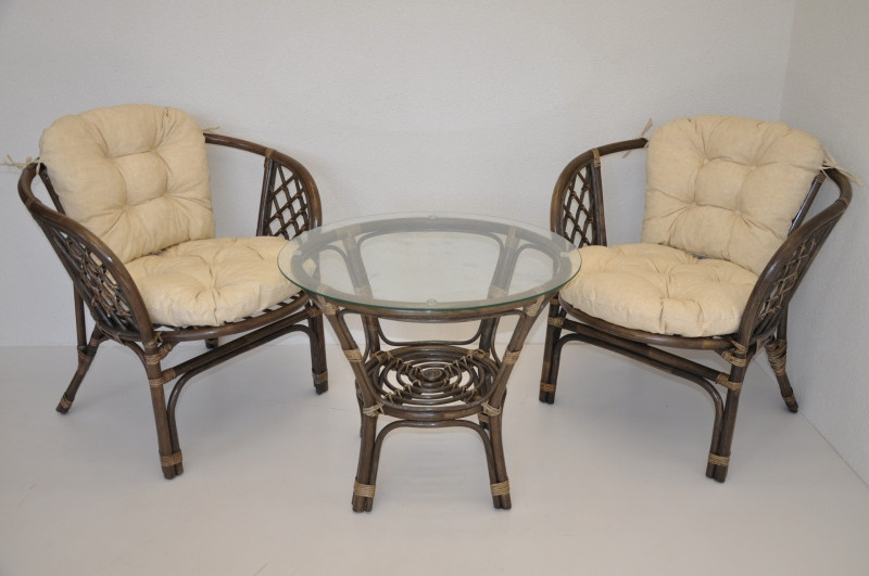 Ratanová sedací souprava Bahama se skládá ze dvou křesel, stolku se skleněnou deskou a kompletní sady polstrů. | Barva ratanové konstrukce je hnědá. Materiál konstrukce je přírodní ratan. Velikost křesla bahama je 68x66x73 cm, výška sedu 44 cm, nosnost křesla je 110 kg. Stolek má výšku 55 cm, průměr stolku 65 cm. Spoje ratanové konstrukce jsou šroubovány. Polstry na tuto sedací soupravu Bahama jsou vyrobeny v České republice. Polstry jsou vyrobeny z kvalitní látky a vyznačují se vysokou kvalitou zpracování.Polstry pro nás vyrábí firma AXIN Cuschions s.r.o., která zaměstnávávýhradně místní vyučené švadleny z České republiky. Tímto způsobem sesnažíme podporovat výrobu a zaměstnanost v naší republice. Náplň polstrů je drcený molitan a polstry lze prát ručně na 40o C.