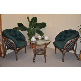 Ratanová sedací souprava Bahama se skládá ze dvou křesel, stolku se skleněnou deskou a kompletní sady polstrů v MAXI provedení. | Barva ratanové konstrukce je hnědá. Materiál konstrukce je přírodní ratan. Velikost křesla bahama je 68x66x73 cm, výška sedu 44 cm, nosnost křesla je 110 kg. Stolek má výšku 55 cm, průměr stolku 60 cm. Spoje ratanové konstrukce jsou šroubovány. Polstry na tuto sedací soupravu Bahama jsou vyrobeny v České republice. Polstry jsou vyrobeny z kvalitní látky a vyznačují se vysokou kvalitou zpracování.Polstry pro nás vyrábí firma AXIN Cuschions s.r.o., která zaměstnávávýhradně místní vyučené švadleny z České republiky. Tímto způsobem sesnažíme podporovat výrobu a zaměstnanost v naší republice. Náplň polstrů je drcený molitan a polstry lze prát ručně na 40o C.
