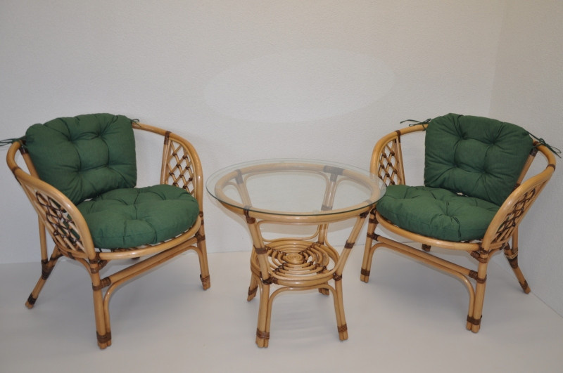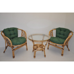 Sedací souprava Bahama patří stále mezi nejoblíbenější ratanové sedací soupravy. Souprava se skládá ze dvou křesel, stolku se skleněnou deskou a kompletní sady polstrů. | Přinášíme Vám oblíbenou sedací soupravu v nevšedním provedení, které dodá sedací soupravě Bahama zcela unikátní vzhled. Barva ratanové konstrukce je medová. Opletení spojů konstrukce je v hnědé barvě. Materiál konstrukce je přírodní ratan. Rozměr křesla je 68x66x73 cm, výška sedu 44 cm, nosnost křesla je 110 kg. Stolek má výšku 55 cm, průměr stolku 70 cm. Spoje ratanové konstrukce jsou šroubovány. Polstry na tuto sedací soupravu jsou vyrobeny v České republice. Polstry jsouvyrobeny z kvalitní látky a vyznačují se vysokou kvalitou zpracování.Polstry pro nás vyrábí firma AXIN Cuschions s.r.o., která zaměstnávávýhradně místní vyučené švadleny z České republiky. Tímto způsobem sesnažíme podporovat výrobu a zaměstnanost v naší republice. Náplň polstrů je drcený molitan a polstry lze prát ručně na 40o C.