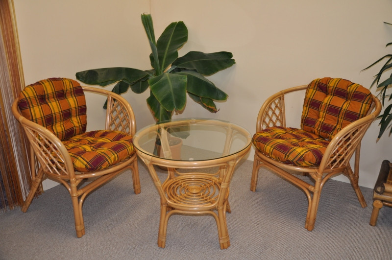 Sedací souprava Bahama patří stále mezi nejoblíbenější ratanové sedací soupravy. Souprava se skládá ze dvou křesel, stolku se skleněnou deskou a kompletní sady polstrů. | Barva ratanové konstrukce je medová. Materiál konstrukce je přírodní ratan. Rozměr křesla je 68x66x73 cm, výška sedu 44 cm, nosnost křesla je 110 kg. Stolek má výšku 55 cm, průměr stolku 65 cm. Spoje ratanové konstrukce jsou šroubovány. Polstry jsou vyrobeny v České republice a lze je prát ručně na 40oC nebo čistit v čistirně.