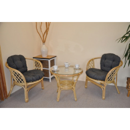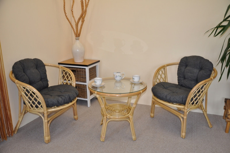 Sedací souprava Bahama patří stále mezi nejoblíbenější ratanové sedací soupravy. Souprava se skládá ze dvou křesel, stolku se skleněnou deskou a kompletní sady polstrů. | Barva ratanové konstrukce je medová. Materiál konstrukce je přírodní ratan. Rozměr křesla je 68x66x73 cm, výška sedu 44 cm, nosnost křesla je 110 kg. Stolek má výšku 55 cm, průměr stolku 65 cm. Spoje ratanové konstrukce jsou šroubovány. Polstry na tuto sedací soupravu jsou vyrobeny v České republice. Polstry jsouvyrobeny z kvalitní látky a vyznačují se vysokou kvalitou zpracování.Polstry pro nás vyrábí firma AXIN Cuschions s.r.o., která zaměstnávávýhradně místní vyučené švadleny z České republiky. Tímto způsobem sesnažíme podporovat výrobu a zaměstnanost v naší republice. Náplň polstrů je drcený molitan a polstry lze prát ručně na 40o C.
