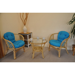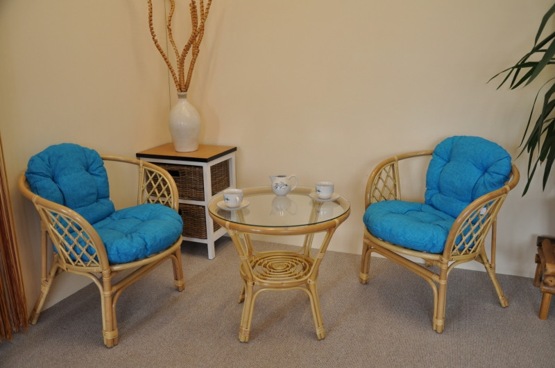 Sedací souprava Bahama patří stále mezi nejoblíbenější ratanové sedací soupravy. Souprava se skládá ze dvou křesel, stolku se skleněnou deskou a kompletní sady polstrů. | Barva ratanové konstrukce je medová. Materiál konstrukce je přírodní ratan. Rozměr křesla je 68x66x73 cm, výška sedu 44 cm, nosnost křesla je 110 kg. Stolek má výšku 55 cm, průměr stolku 65 cm. Spoje ratanové konstrukce jsou šroubovány. Polstry na tuto sedací soupravu Bahama jsou vyrobeny v České republice. Polstry jsou vyrobeny z kvalitní látky a vyznačují se vysokou kvalitou zpracování.Polstry pro nás vyrábí firma AXIN Cuschions s.r.o., která zaměstnávávýhradně místní vyučené švadleny z České republiky. Tímto způsobem sesnažíme podporovat výrobu a zaměstnanost v naší republice. Náplň polstrů je drcený molitan a polstry lze prát ručně na 40o C.