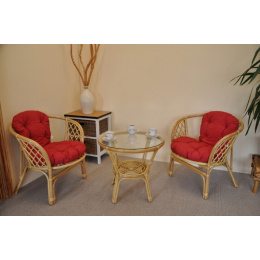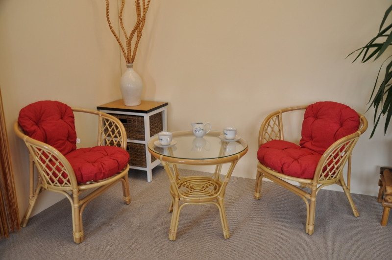 Sedací souprava Bahama patří stále mezi nejoblíbenější ratanové sedací soupravy. Souprava se skládá ze dvou křesel, stolku se skleněnou deskou a kompletní sady polstrů. | Barva ratanové konstrukce je medová. Materiál konstrukce je přírodní ratan. Rozměr křesla je 68x66x73 cm, výška sedu 44 cm, nosnost křesla je 110 kg. Stolek má výšku 55 cm, průměr stolku 65 cm. Spoje ratanové konstrukce jsou šroubovány. Polstry na tuto sedací soupravu jsou vyrobeny v České republice. Polstry jsouvyrobeny z kvalitní látky a vyznačují se vysokou kvalitou zpracování.Polstry pro nás vyrábí firma AXIN Cuschions s.r.o., která zaměstnávávýhradně místní vyučené švadleny z České republiky. Tímto způsobem sesnažíme podporovat výrobu a zaměstnanost v naší republice. Náplň polstrů je drcený molitan a polstry lze prát ručně na 40o C.