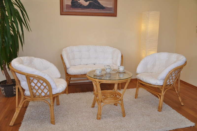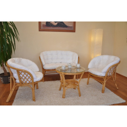 Ratanový nábytek - ratanová sedací souprava Bahama je vyrobena z přírodního ratanu s barvou konstrukce v medovém odstínu. Souprava obsahuje pohovku, 2 křesla, stolek se sklem a kompletní sadu polstrů vyrobených v České republice. | Barva ratanové konstrukce i ratanového výpletu je medová. Velikost pohovky je 115x66x73 cm, nosnost pohovky je 150 kg. Velikost křesla je 68x66x73 cm, nosnost křesla je 110 kg. Výška sedu je 44 cm. Stolek má výšku 55 cm, průměr stolku je 60 cm. Spoje ratanové konstrukce jsou šroubovány. Polstry na tuto sedací soupravu Bahama jsou vyrobeny v České republice. Polstry jsou vyrobeny z kvalitní látky a vyznačují se vysokou kvalitou zpracování.Polstry pro nás vyrábí firma AXIN Cuschions s.r.o., která zaměstnávávýhradně místní vyučené švadleny z České republiky. Tímto způsobem sesnažíme podporovat výrobu a zaměstnanost v naší republice.Náplň polstrů je drcený molitan a polstry lze prát ručně na 40o C.