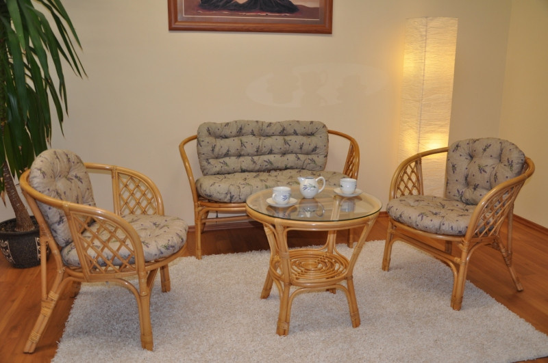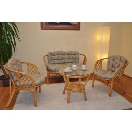 Ratanový nábytek - ratanová sedací souprava Bahama je vyrobena z přírodního ratanu s barvou konstrukce v medovém odstínu. Souprava obsahuje pohovku, 2 křesla, stolek se sklem a kompletní sadu polstrů vyrobených v České republice. | Barva ratanové konstrukce i ratanového výpletu je medová. Velikost pohovky je 115x66x73 cm, nosnost pohovky je 150 kg. Velikost křesla je 68x66x73 cm, nosnost křesla je 110 kg. Výška sedu je 44 cm. Stolek má výšku 55 cm, průměr stolku je 60 cm. Spoje ratanové konstrukce jsou šroubovány. Polstry na tuto sedací soupravu Bahama jsou vyrobeny v České republice. Polstry jsou vyrobeny z kvalitní látky a vyznačují se vysokou kvalitou zpracování.Polstry pro nás vyrábí firma AXIN Cuschions s.r.o., která zaměstnávávýhradně místní vyučené švadleny z České republiky. Tímto způsobem sesnažíme podporovat výrobu a zaměstnanost v naší republice.Náplň polstrů je drcený molitan a polstry lze prát ručně na 40o C.