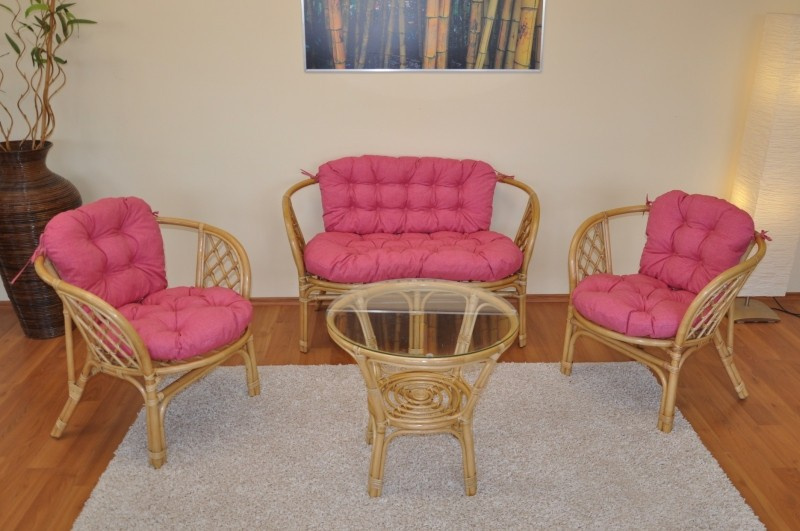 Ratanová sedací souprava Bahama medová velká polstry malinový melír