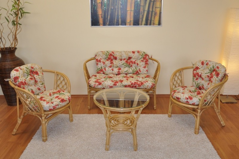 Ratanová sedací souprava Bahama medová velká polstry motiv vlčí máky