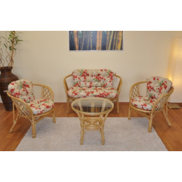 Ratanový nábytek - ratanová sedací souprava Bahama je vyrobena z přírodního ratanu s barvou konstrukce v medovém odstínu. Souprava obsahuje pohovku, 2 křesla, stolek se sklem a kompletní sadu polstrů vyrobených v České republice. | Barva ratanové konstrukce i ratanového výpletu je medová. Velikost pohovky je 115x66x73 cm, nosnost pohovky je 150 kg. Velikost křesla je 68x66x73 cm, nosnost křesla je 110 kg. Výška sedu je 44 cm. Stolek má výšku 55 cm, průměr stolku je 60 cm. Spoje ratanové konstrukce jsou šroubovány. Polstry na tuto sedací soupravu Bahama jsou vyrobeny v České republice. Polstry jsou vyrobeny z kvalitní látky a vyznačují se vysokou kvalitou zpracování.Polstry pro nás vyrábí firma AXIN Cuschions s.r.o., která zaměstnávávýhradně místní vyučené švadleny z České republiky. Tímto způsobem sesnažíme podporovat výrobu a zaměstnanost v naší republice.Náplň polstrů je drcený molitan a polstry lze prát ručně na 40o C.