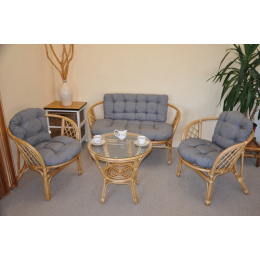 Ratanový nábytek - ratanová sedací souprava Bahama je vyrobena z přírodního ratanu s barvou konstrukce v medovém odstínu. Souprava obsahuje pohovku, 2 křesla, stolek se sklem a kompletní sadu velice kvalitních polstrů. | Barva ratanové konstrukce i ratanového výpletu je medová. Velikost pohovky je 115x66x73 cm, nosnost pohovky je 150 kg. Velikost křesla je 68x66x73 cm, nosnost křesla je 110 kg. Výška sedu je 44 cm. Stolek má výšku 55 cm, průměr stolku je 60 cm. Spoje ratanové konstrukce jsou šroubovány. Polstry na tuto sedací soupravu Bahama jsou vyrobeny v České republice. Polstry jsou vyrobeny z kvalitní látky a vyznačují se vysokou kvalitou zpracování.Polstry pro nás vyrábí firma AXIN Cuschions s.r.o., která zaměstnávávýhradně místní vyučené švadleny z České republiky. Tímto způsobem sesnažíme podporovat výrobu a zaměstnanost v naší republice.Náplň polstrů je drcený molitan a polstry lze prát ručně na 40o C.