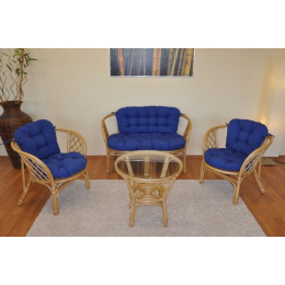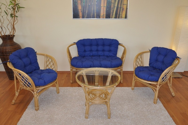 Ratanová sedací souprava Bahama medová velká polstry tmavě modrý melír
