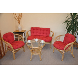 Ratanový nábytek - ratanová sedací souprava Bahama je vyrobena z přírodního ratanu s barvou konstrukce v medovém odstínu. Souprava obsahuje pohovku, 2 křesla, stolek se sklem a kompletní sadu velice kvalitních polstrů. | Barva ratanové konstrukce i ratanového výpletu je medová. Velikost pohovky je 115x66x73 cm, nosnost pohovky je 150 kg. Velikost křesla je 68x66x73 cm, nosnost křesla je 110 kg. Výška sedu je 44 cm. Stolek má výšku 55 cm, průměr stolku je 60 cm. Spoje ratanové konstrukce jsou šroubovány. Polstry na tuto sedací soupravu Bahama jsou vyrobeny v České republice. Polstry jsou vyrobeny z kvalitní látky a vyznačují se vysokou kvalitou zpracování.Polstry pro nás vyrábí firma AXIN Cuschions s.r.o., která zaměstnávávýhradně místní vyučené švadleny z České republiky. Tímto způsobem sesnažíme podporovat výrobu a zaměstnanost v naší republice.Náplň polstrů je drcený molitan a polstry lze prát ručně na 40o C.