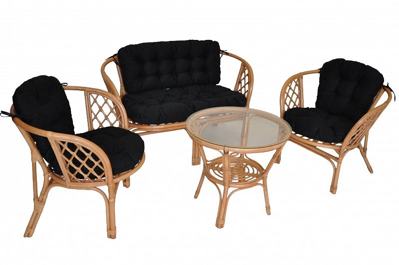Ratanový nábytek - ratanová sedací souprava Bahama je vyrobena z přírodního ratanu s barvou konstrukce v tmavě medovém odstínu. Souprava obsahuje pohovku, 2 křesla, stolek se sklem a kompletní sadu polstrů. | Barva ratanové konstrukce i ratanového výpletu je tmavý med. Velikost pohovky je 115x66x73 cm, nosnost pohovky je 150 kg. Velikost křesla je 68x66x73 cm, nosnost křesla je 110 kg. Výška sedu je 44 cm. Stolek má výšku 55 cm, průměr stolku je 60 cm. Náplň polstrů je drcený molitan a polstry lze prát ručně na 40o C.
