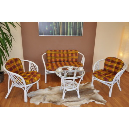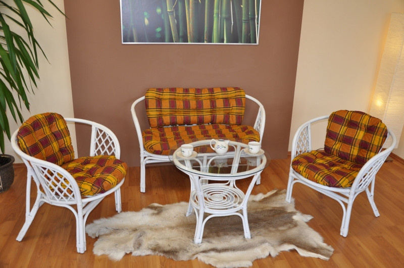 Ratanový nábytek - ratanová sedací souprava je vyrobena z přírodního ratanu s barvou konstrukce odpovádající fotografii výrobku,obsahuje lavici,2 křesla a stolek se sklem, kompletní sadu polstrů vyrobených v České republice. | Barva ratanové konstrukce je bílá. Hlavní spoje ratanové konstrukce jsou šroubovány. Rozměr lavice 115x66x73 cm, nosnost lavice 150 kg. Rozměr křesla 68x66x73 cm, nosnost křesla 110 kg. Výška sedu je příjemných 44 cm. Stolek výška 55 cm, průměr stolku 65 cm. Polstry lze prát ručně na 40oC nebo čistit v čistírně.