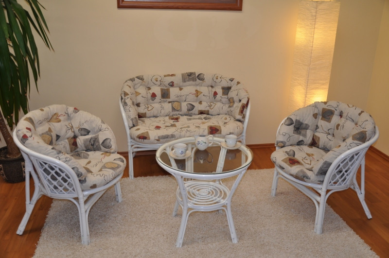 Ratanový nábytek - ratanová sedací souprava je vyrobena z přírodního ratanu s barvou konstrukce odpovádající fotografii výrobku,obsahuje lavici,2 křesla a stolek se sklem, kompletní sadu polstrů v MAXI provedení vyrobených v České republice. | Barva ratanové konstrukce je bílá. Hlavní spoje ratanové konstrukce jsou šroubovány. Rozměr lavice 115x66x73 cm, nosnost lavice 150 kg. Rozměr křesla 68x66x73 cm, nosnost křesla 110 kg. Výška sedu je příjemných 44 cm. Stolek výška 55 cm, průměr stolku 65 cm. Polstry na tuto sedací soupravu Bahama jsou vyrobeny v České republice. Polstry jsou vyrobeny z kvalitní látky a vyznačují se vysokou kvalitou zpracování.Polstry pro nás vyrábí firma AXIN Cuschions s.r.o., která zaměstnávávýhradně místní vyučené švadleny z České republiky. Tímto způsobem sesnažíme podporovat výrobu a zaměstnanost v naší republice.Náplň polstrů je drcený molitan a polstry lze prát ručně na 40o C.