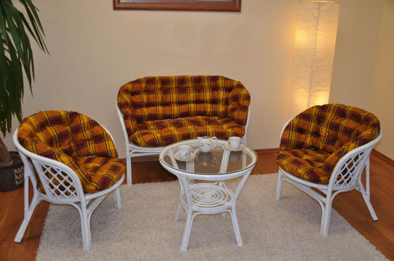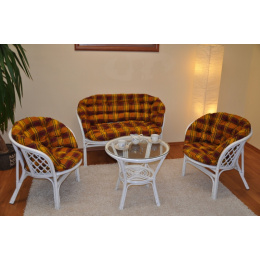 Ratanový nábytek - ratanová sedací souprava je vyrobena z přírodního ratanu s barvou konstrukce odpovádající fotografii výrobku,obsahuje lavici,2 křesla a stolek se sklem, kompletní sadu polstrů v MAXI provedení vyrobených v České republice. | Barva ratanové konstrukce je bílá. Hlavní spoje ratanové konstrukce jsou šroubovány. Rozměr lavice 115x66x73 cm, nosnost lavice 150 kg. Rozměr křesla 68x66x73 cm, nosnost křesla 110 kg. Výška sedu je příjemných 44 cm. Stolek výška 55 cm, průměr stolku 65 cm. Polstry lze prát ručně na 40oC nebo čistit v čistírně.