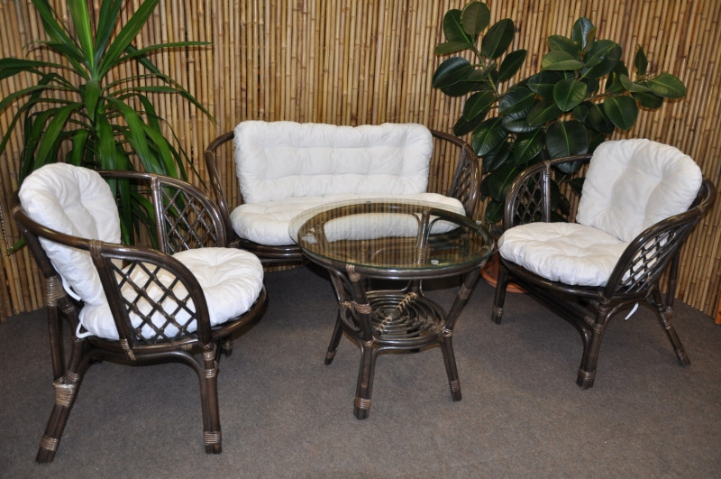 Ratanový nábytek - ratanová sedací souprava je vyrobena z přírodního ratanu s barvou konstrukce odpovádající fotografii výrobku,obsahuje lavici,2 křesla a stolek se sklem, kompletní sadu polstrů vyrobených v České republice | Barva ratanové konstrukce je hnědá, spoje ratanové konstrukce jsou šroubovány. Rozměr lavice 115x66x73 cm, rozměr křesla 68x66x73 cm, stolek výška 55 cm, průměr stolku 60 cm,nosnost lavice 150 kg, nosnost křesla 110 kg, Polstry lze prát ručně na 40oC nebo čistit v čistírně