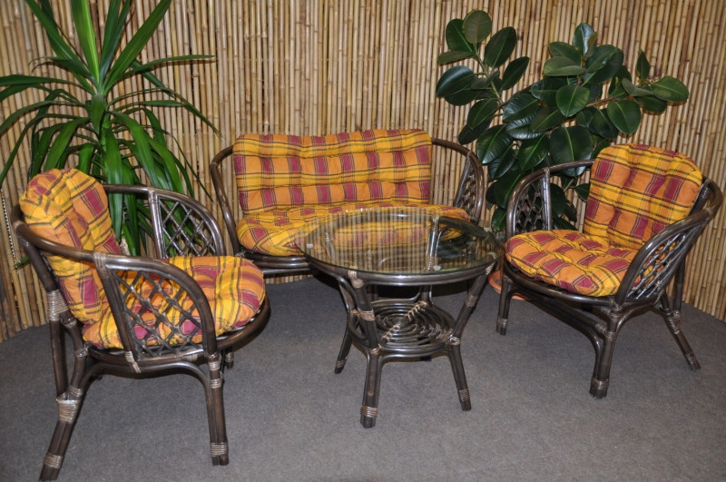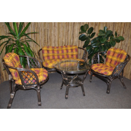 Ratanový nábytek - ratanová sedací souprava je vyrobena z přírodního ratanu s barvou konstrukce odpovádající fotografii výrobku,obsahuje lavici,2 křesla a stolek se sklem, kompletní sadu polstrů vyrobených v České republice | Barva ratanové konstrukce je hnědá, spoje ratanové konstrukce jsou šroubovány. Velikost pohovky je 115x66x73 cm Velikost křesla je 68x66x73 cm Stolek výška 55 cm, průměr stolku 60 cm Nosnost pohovky je 150 kg Nosnost křesla je 110 kg, Polstry lze prát ručně na 40oC nebo čistit v čistírně