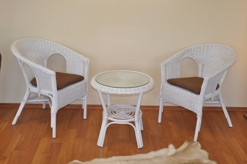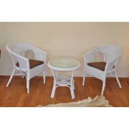 Ratanový nábytek - ratanová sedací souprava je vyrobena z přírodního ratanu v bílé barvě konstrukce. | Souprava obsahuje 2 křesla a stolek se sklem, kompletní sadu polstrů dle obrázku Masivní ratanová konstrukce s ratanovým výpletem z proutků průměr 3 mm. Barva ratanové konstrukce i výpletu je bílá. Rozměr křesla je 58x57x76 cm, nosnost křesla 110 kg Stolek se sklem průměr 50 cm, výška stolku je 55 cm Polstry jsou vyrobeny v České republice. Spoje ratanové konstrukce jsou šroubovány.