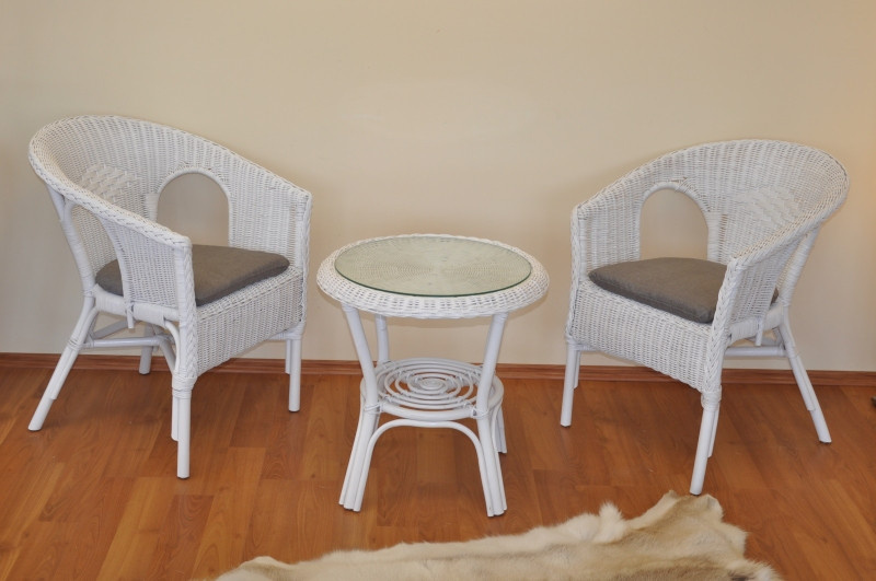Ratanový nábytek - ratanová sedací souprava je vyrobena z přírodního ratanu v bílé barvě konstrukce. | Souprava obsahuje 2 křesla a stolek se sklem, kompletní sadu polstrů dle obrázku Masivní ratanová konstrukce s ratanovým výpletem z proutků průměr 3 mm. Barva ratanové konstrukce i výpletu je bílá. Rozměr křesla je 58x57x76 cm, nosnost křesla 110 kg Stolek se sklem průměr 50 cm, výška stolku je 55 cm Polstry jsou vyrobeny v České republice. Spoje ratanové konstrukce jsou šroubovány.
