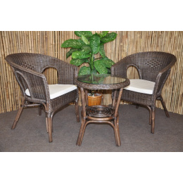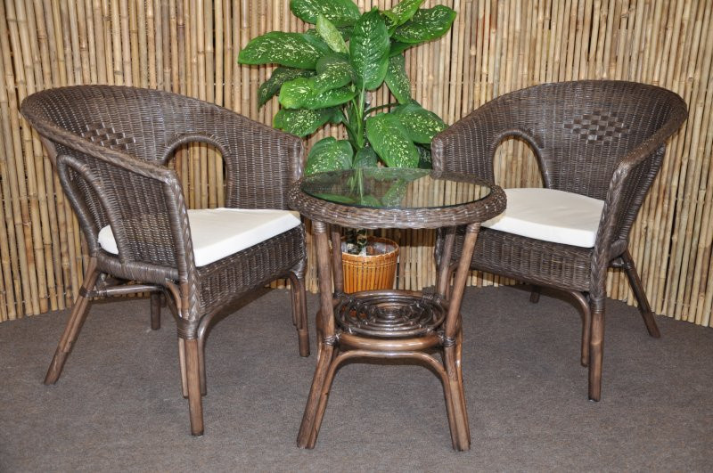 Ratanový nábytek - ratanová sedací souprava je vyrobena z přírodního ratanu v hnědé barvě konstrukce, souprava obsahuje 2 křesla a stolek se sklem, kompletní sadu polstrů | Masivní ratanová konstrukce s ratanovým výpletem z proutků průměr 3 mm. Barva ratanové konstrukce i výpletu je hnědá. Rozměr křesla je 58x57x76 cm, nosnost křesla 110 kg Stolek se sklem průměr 50 cm, výška stolku je 55 cm Polstry jsou vyrobeny v České republice. Spoje ratanové konstrukce jsou šroubovány.