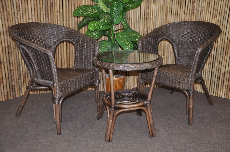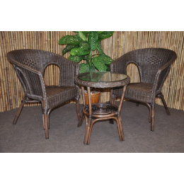 Ratanový nábytek - ratanová sedací souprava je vyrobena z přírodního ratanu v hnědé barvě konstrukce, souprava obsahuje 2 křesla a stolek se sklem | Masivní ratanová konstrukce s ratanovým výpletem z proutků průměr 3 mm. Barva ratanové konstrukce i výpletu je hnědá. Rozměr křesla je 58x57x76 cm, nosnost křesla 110 kg Stolek se sklem průměr 50 cm, výška stolku je 55 cm Spoje ratanové konstrukce jsou šroubovány.