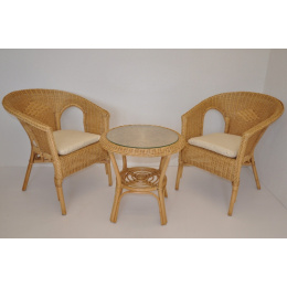 Ratanový nábytek - ratanová sedací souprava je vyrobena z přírodního ratanu v medové barvě konstrukce. | Masivní ratanová konstrukce s ratanovým výpletem z proutků průměr 3 mm. Barva ratanové konstrukce i výpletu je medová. Rozměr křesla je 58x57x76 cm, nosnost křesla 110 kg Stolek se sklem průměr 55 cm, výška stolku je 55 cm Polstry jsou vyrobeny v České republice. Spoje ratanové konstrukce jsou šroubovány.