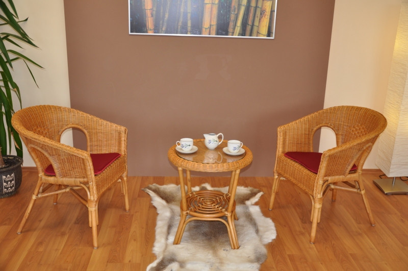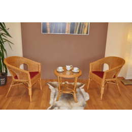 Ratanový nábytek - ratanová sedací souprava je vyrobena z přírodního ratanu v medové barvě konstrukce. | Masivní ratanová konstrukce s ratanovým výpletem z proutků průměr 3 mm. Barva ratanové konstrukce i výpletu je medová. Rozměr křesla je 58x57x76 cm, nosnost křesla 110 kg Stolek se sklem průměr 55 cm, výška stolku je 55 cm Polstry jsou vyrobeny v České republice. Spoje ratanové konstrukce jsou šroubovány.