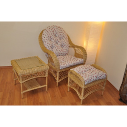 Nádherná ratanová sedací souprava vyrobená z přírodního ratanu s kostrou z masivních ratanový tyčí a výpletem z ratanových proutků. | Křeslo je díky propracované a příjemně tvarované konstrukci velice pohodlné. Barva ratanové konstrukce i ratanového výpletu je medová. Velikost křesla Florida je 76x80x97 cm, nosnost křesla je 130 kg a výška sedu je 45 cm. Velikost ratanové taburetky Florida je 52x40x48 cm, výška sedu je 45 cm a nosnost 120 kg. Odkládací stolek Florida má velikost 52x52x50 cm a je také opatřen skleněnou deskou. Polstry z kvalitní potahové látky jsou vyrobeny v České republice.