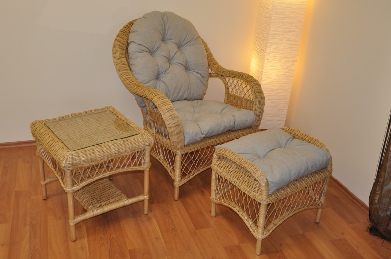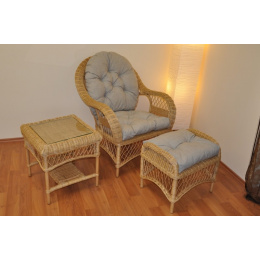 Nádherná ratanová sedací souprava vyrobená z přírodního ratanu s kostrou z masivních ratanový tyčí a výpletem z ratanových proutků. | Křeslo je díky propracované a příjemně tvarované konstrukci velice pohodlné. Barva ratanové konstrukce i ratanového výpletu je medová. Velikost křesla Florida je 76x80x97 cm, nosnost křesla je 130 kg a výška sedu je 45 cm. Velikost ratanové taburetky Florida je 52x40x48 cm, výška sedu je 45 cm a nosnost 120 kg. Odkládací stolek Florida má velikost 52x52x50 cm a je také opatřen skleněnou deskou. Polstry z kvalitní potahové látky jsou vyrobeny v České republice.