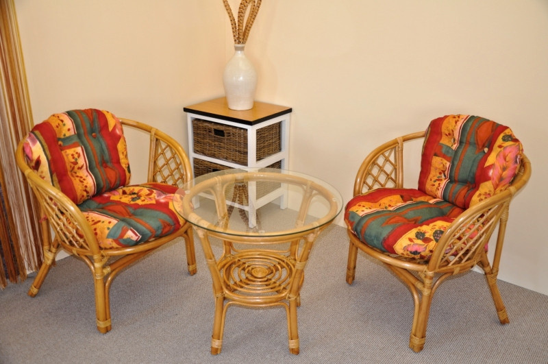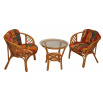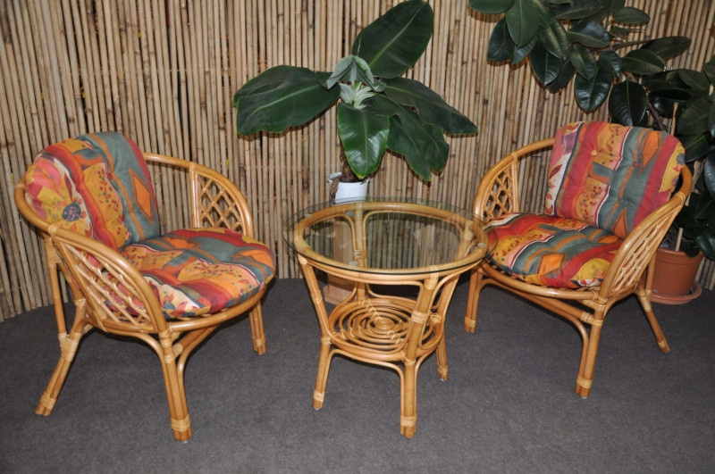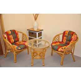 Ratanová sedací souprava Jawa vychází konstrukčně z velice oblíbené sedací soupravy Bahama. Sedací soupravu prodáváme jako celek 2 křesílka, stolek se sklem a sadu polstrů. | Sedací souprava je vyrobena z přírodního ratanu. Barva ratanové konstrukce i výpletu je medová. Velikost křesla 67x65x72 cm, nosnost křesla je 110 kg, výška sedu je 42 cm. Průměr skleněné desky stolku je 60 cm, výška stolku je 56 cm. Polstry jsou vyrobeny v Indonesii.