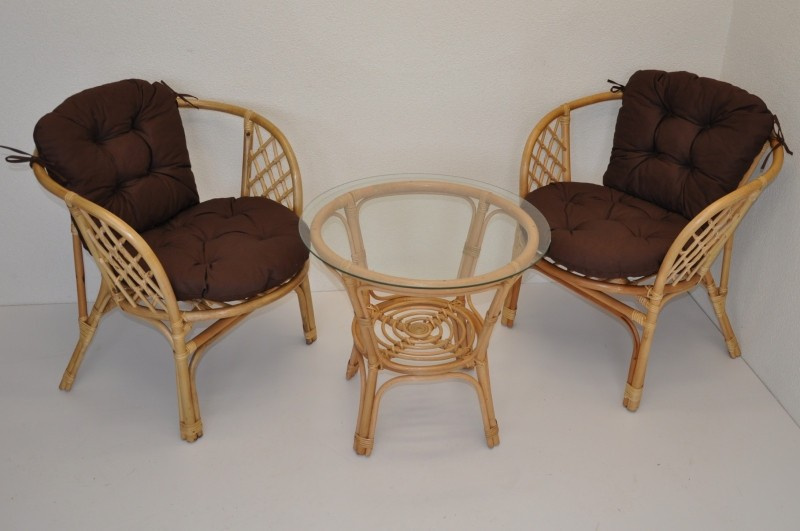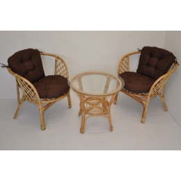 Úklid skladu. Ratanová sedací souprava Jawa vychází konstrukčně z velice oblíbené sedací soupravy Bahama. Sedací soupravu prodáváme jako celek 2 křesílka, stolek se sklem a sadu polstrů. | Sedací souprava je vyrobena z přírodního ratanu. Barva ratanové konstrukce i výpletu je medová. Velikost křesla 67x65x72 cm, nosnost křesla je 110 kg, výška sedu je 42 cm. Průměr skleněné desky stolku je 60 cm, výška stolku je 56 cm. Polstry jsou vyrobeny v Indonesii.