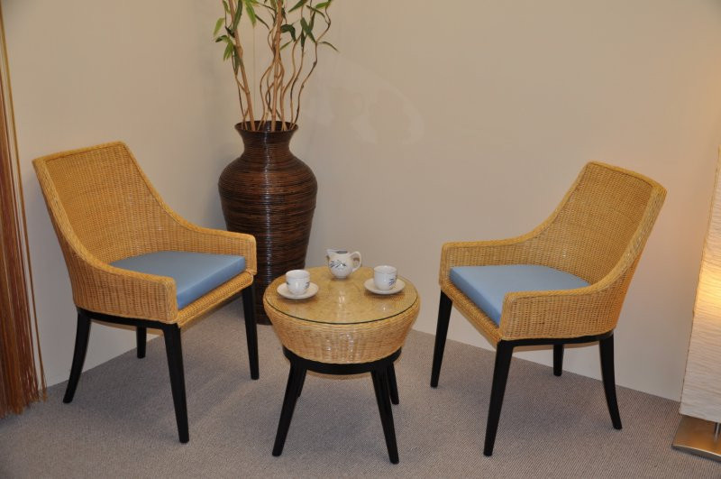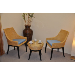 Ratanová sedací souprava Nasvile se skládá ze dvou křesel s polstry a stolku se skleněnou deskou. | Nádherná ratanová sedací souprava s prvky masivního mahagonového dřeva. Velikost křesla je 55x65x89 cm. Výška sedu křesla je 50 cm. Nosnost křesla je 125 kg. Velikost stolku se skleněnou deskou je: průměr 52 cm, výška 52 cm.