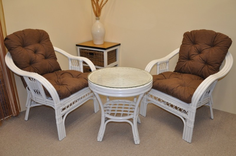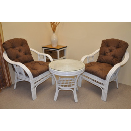 Ratanová sedací souprava je vyrobena z přírodního ratanu z masivních ratanových tyčí. Součástí soupravy jsou 2 křesla, stolek a sada polstrů. | Konstrukce ratanové sedací soupravy je na většině míst trojitá a tím velice pevná. Křesla jsou velice pohodlná díky rozložitému tvaru a kvalitním polštářům. Barva ratanové kontrukce a výpletu je bílá. Velikost křesla je 68x75x74 cm, nosnost křesla je 125 kg. Výška sedu je 44 cm. Stolek má průměr 55 cm a je 55 cm vysoký.