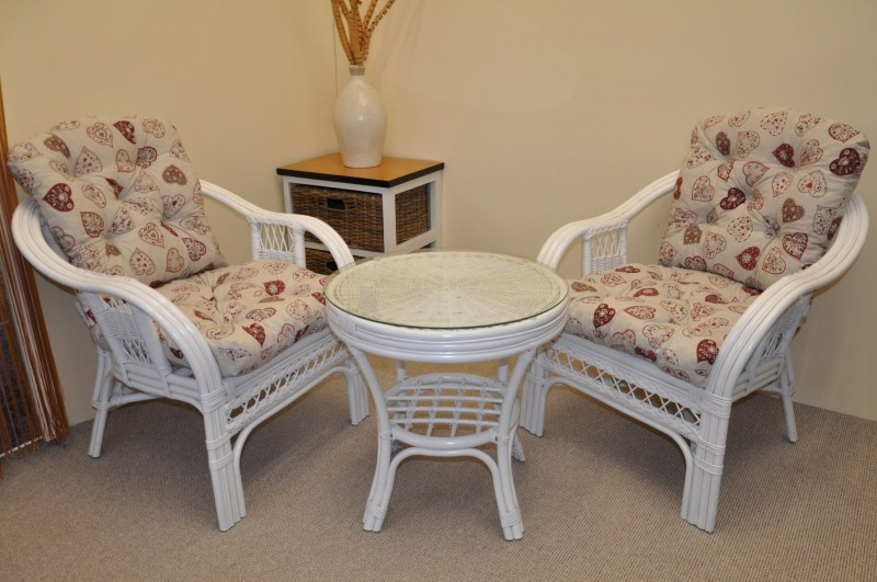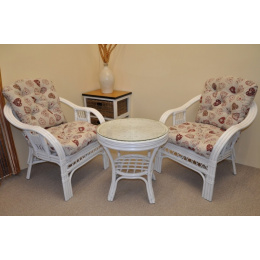 Ratanová sedací souprava je vyrobena z přírodního ratanu z masivních ratanových tyčí. Součástí soupravy jsou 2 křesla, stolek a sada polstrů. | Konstrukce ratanové sedací soupravy je na většině míst trojitá a tím velice pevná. Křesla jsou velice pohodlná díky rozložitému tvaru a kvalitním polštářům. Barva ratanové kontrukce a výpletu je bílá. Velikost křesla je 68x75x74 cm, nosnost křesla je 125 kg. Výška sedu je 44 cm. Stolek má průměr 55 cm a je 55 cm vysoký.