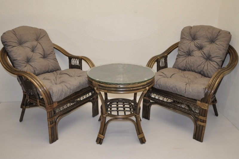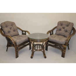 Ratanová sedací souprava je vyrobena z přírodního ratanu z masivních ratanových tyčí. Součástí soupravy jsou 2 křesla, stolek a sada polstrů. | Konstrukce ratanové sedací soupravy je na většině míst trojitá a tím velice pevná. Křesla jsou velice pohodlná díky rozložitému tvaru a kvalitním polštářům. Barva ratanové kontrukce a výpletu je hnědá. Velikost křesla je 68x75x74 cm, nosnost křesla je 125 kg. Výška sedu je 44 cm. Stolek má průměr 55 cm a je 55 cm vysoký.