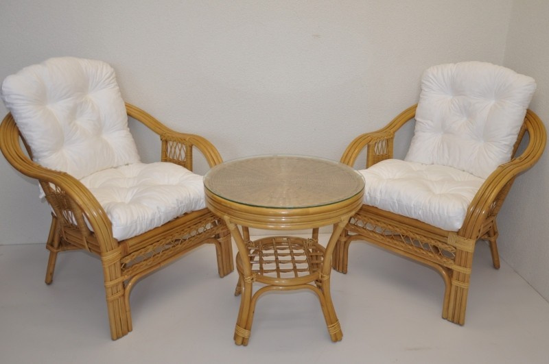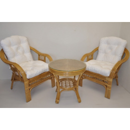 Ratanová sedací souprava je vyrobena z přírodního ratanu z masivních ratanových tyčí. Součástí soupravy jsou 2 křesla, stolek a sada polstrů. | Konstrukce ratanové sedací soupravy je na většině míst trojitá a tím velice pevná. Křesla jsou velice pohodlná díky rozložitému tvaru a kvalitním polštářům. Barva ratanové kontrukce a výpletu je medová. Velikost křesla je 68x75x74 cm, nosnost křesla je 125 kg. Výška sedu je 44 cm. Stolek má průměr 55 cm a je 55 cm vysoký.