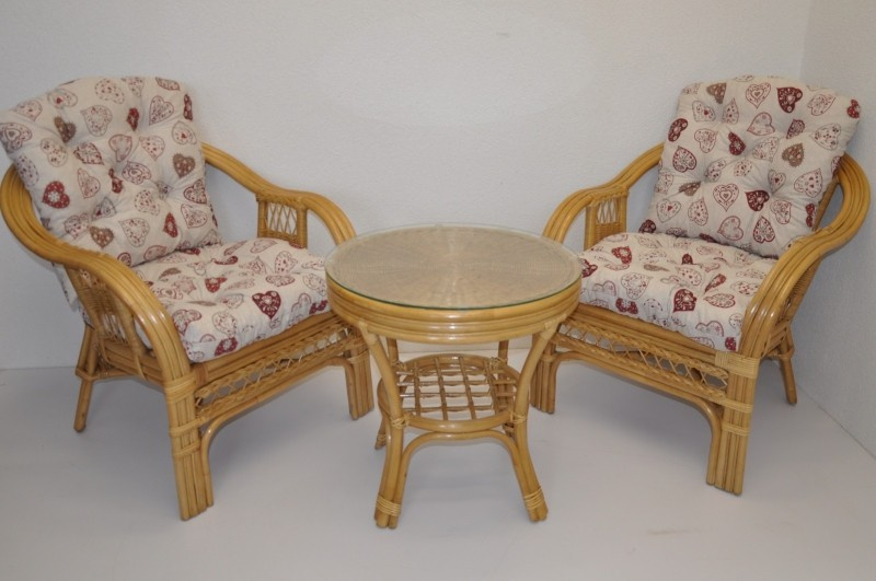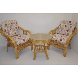 Ratanová sedací souprava je vyrobena z přírodního ratanu z masivních ratanových tyčí. Součástí soupravy jsou 2 křesla, stolek a sada polstrů. | Konstrukce ratanové sedací soupravy je na většině míst trojitá a tím velice pevná. Křesla jsou velice pohodlná díky rozložitému tvaru a kvalitním polštářům. Barva ratanové kontrukce a výpletu je medová. Velikost křesla je 68x75x74 cm, nosnost křesla je 125 kg. Výška sedu je 44 cm. Stolek má průměr 55 cm a je 55 cm vysoký.