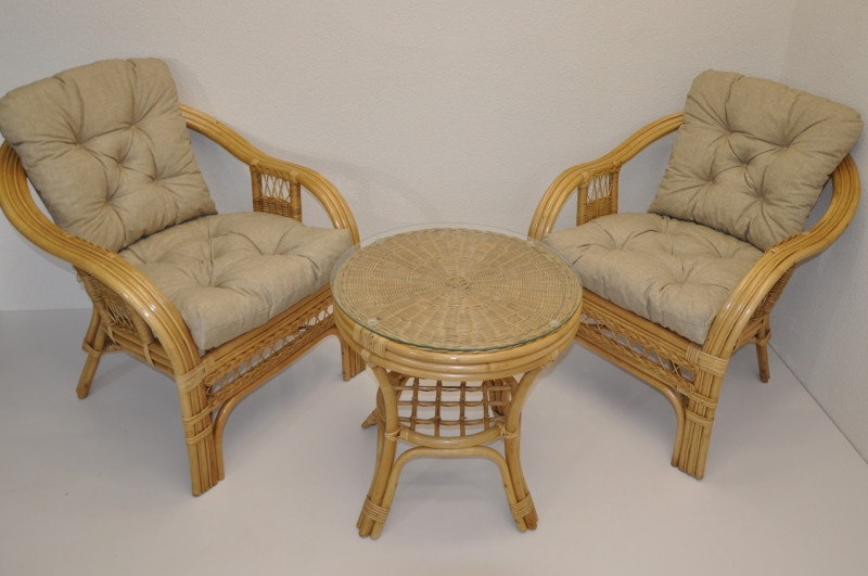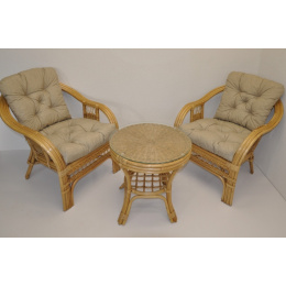 Ratanová sedací souprava je vyrobena z přírodního ratanu z masivních ratanových tyčí. Součástí soupravy jsou 2 křesla, stolek a sada polstrů. | Konstrukce ratanové sedací soupravy je na většině míst trojitá a tím velice pevná. Křesla jsou velice pohodlná díky rozložitému tvaru a kvalitním polštářům. Barva ratanové kontrukce a výpletu je medová. Velikost křesla je 68x75x74 cm, nosnost křesla je 125 kg. Výška sedu je 44 cm. Stolek má průměr 55 cm a je 55 cm vysoký.