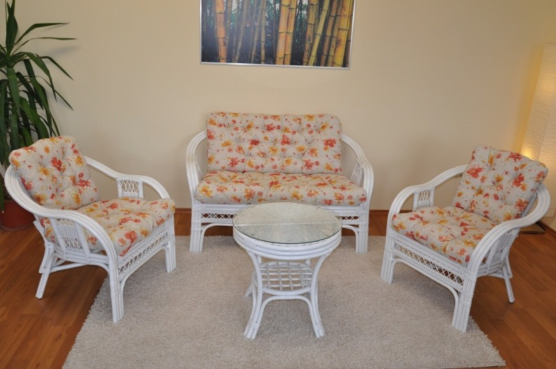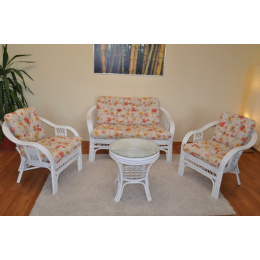 Ratanová sedací souprava je vyrobena z přírodního ratanu z masivních ratanových tyčí. Součástí soupravy je pohovka, 2 křesla, stolek a sada polstrů. | Konstrukce ratanové sedací soupravy je na většině míst trojitá a tím velice pevná. Křesla a pohovka jsou velice pohodlné díky rozložitému tvaru a kvalitním polštářům. Barva ratanové kontrukce a výpletu je bílá. Velikost pohovky je 118x75x74 cm, nosnost 180 kg. Velikost křesla je 68x75x74 cm, nosnost křesla je 125 kg. Výška sedu je 44 cm. Stolek má průměr 55 cm a je 55 cm vysoký.