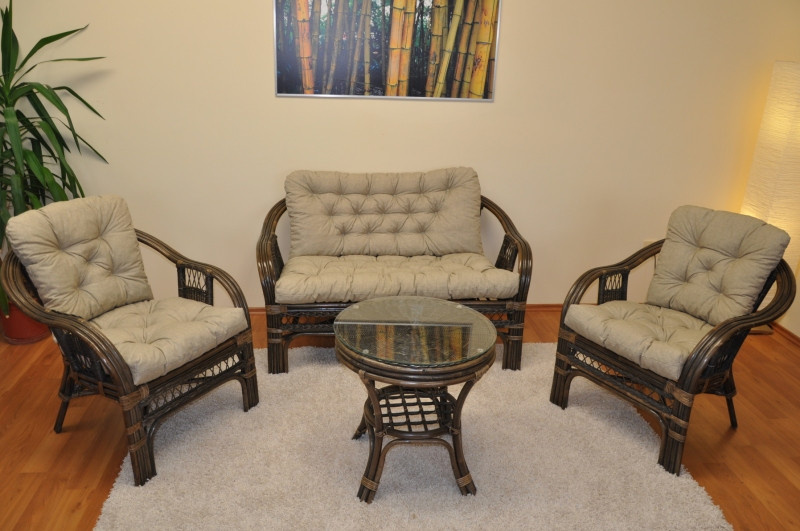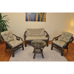Ratanová sedací souprava je vyrobena z přírodního ratanu z masivních ratanových tyčí. Součástí soupravy je pohovka, 2 křesla, stolek a sada polstrů. | Konstrukce ratanové sedací soupravy je na většině míst trojitá a tím velice pevná. Křesla a pohovka jsou velice pohodlné díky rozložitému tvaru a kvalitním polštářům. Barva ratanové kontrukce a výpletu je hnědá. Velikost pohovky je 118x75x74 cm, nosnost 180 kg. Velikost křesla je 68x75x74 cm, nosnost křesla je 125 kg. Výška sedu je 44 cm. Stolek má průměr 55 cm a je 55 cm vysoký.